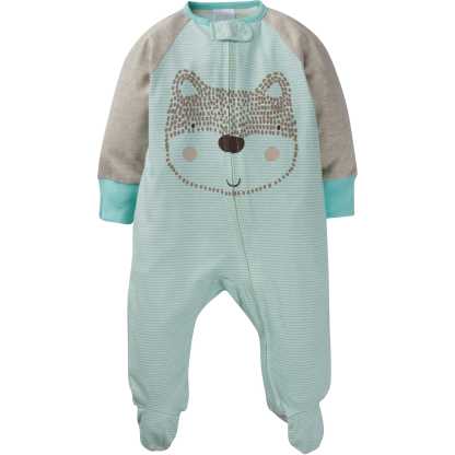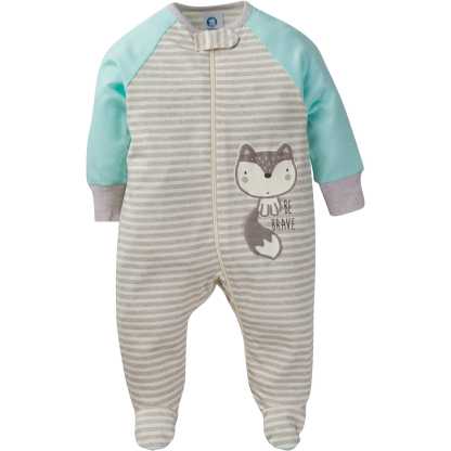 This 4-pack of baby boys' Sleep N' Plays from Gerber makes getting dressed in the morning more fun! Adorable themed designs featured in screenprint, flocking, and puff techniques give him plenty of new reasons to smile. He'll enjoy the soft, breathable feel of the 100% cotton jersey. The time saving convenience of the zip front opening streamlines everyday chores like diaper changing and dressing. Machine wash and dry fabric takes a load off of mom on laundry days!