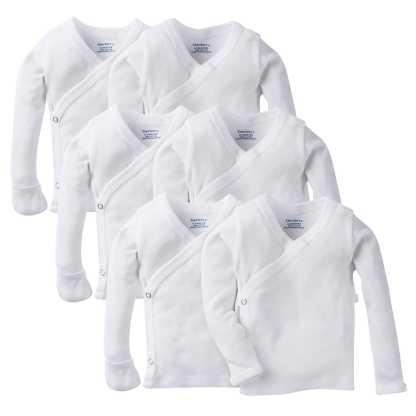 Make life more convenient with this 6-pack of baby boy or girl white long sleeve side snap shirts with mitten cuffs. White matches anything in your little one's wardrobe, making it an ideal choice for everyday use. The side snap design simplifies the morning Dressing routine, while the attached mitten cuffs keep sharp little fingernails away from the face. Made from 100% cotton rib, these shirts are easy care for, so you'll never spend more time than you need to on laundry day duties!