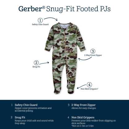 Designed for every season, our buttery soft collection of affordable rompers, sleepwear, Dresses and headbands will be their new wardrobe favs! We've partnered with Livaeco? by Birla Cellulose to bring you and your little ones a more sustainably produced, environmentally-friendly viscose fiber collection made predominately from eucalyptus blended with spandex. This extremely soft camo print footed pajama is super comfy and designed for long wear. Features a double zipper to make changes super easy. High-quality, lightweight, breathable, durable fabric with the perfect amount of stretch for active babies and toddlers. Prints and solids made for sibling matching. A bedtime favorite for sure. Gerber? quality, comfort, safety and value never goes out of style!