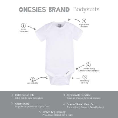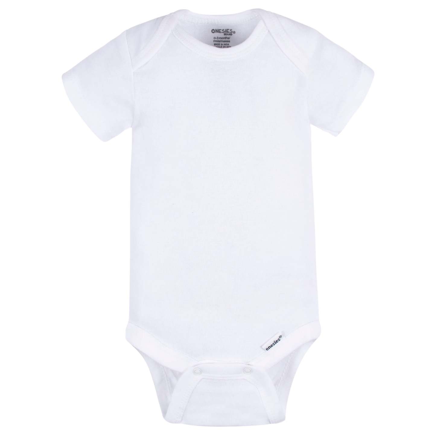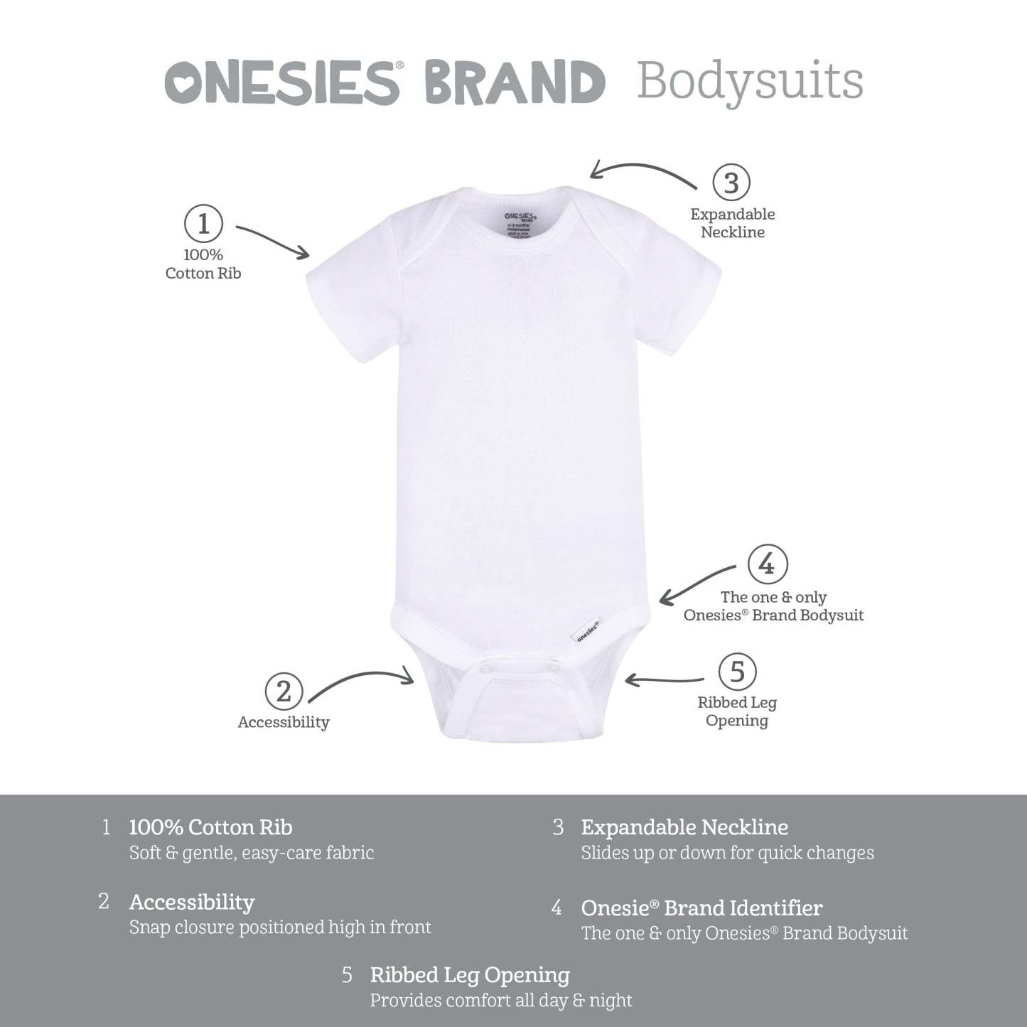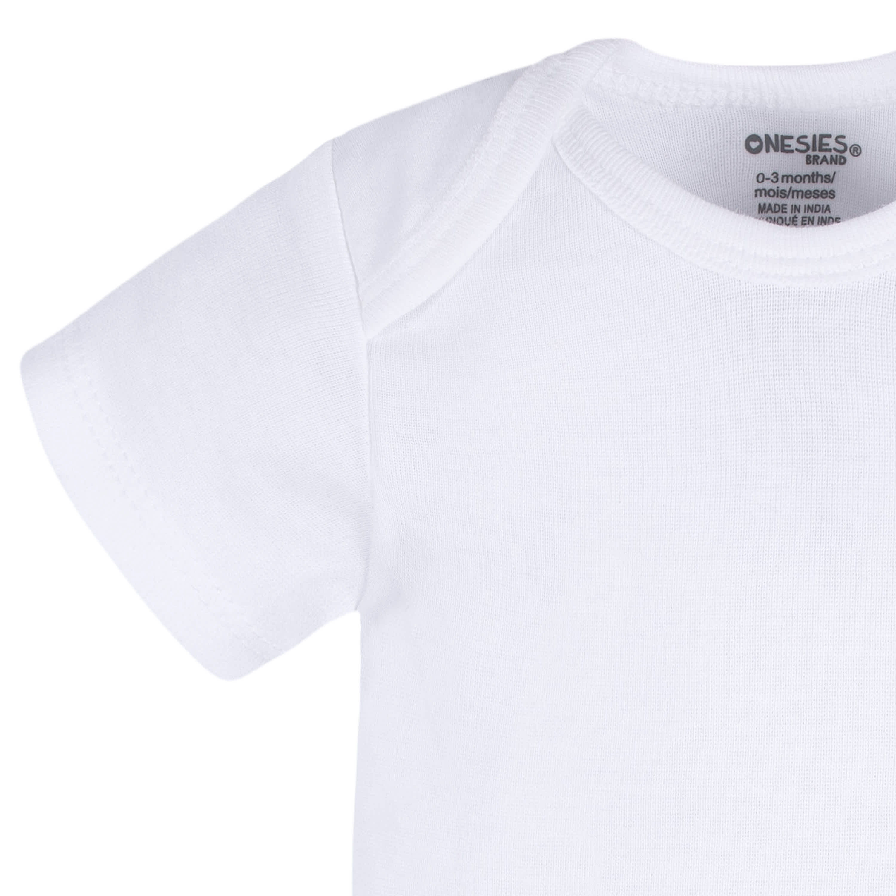 Rest easy knowing you're well-supplied with these baby essentials! This 2-pack of baby boy or girl unisex short sleeve Onesies庐 bodysuits is a versatile choice. The solid white color makes them perfect for pairing with any bottom. When used as a cozy underlayer, they'll keep your baby warm and comfortable in cooler weather. 100% cotton rib provides added breathability. A handy bottom snap closure simplifies diaper changing. An easily-expandable lap shoulder neckline makes them quick to pull on in the morning. Streamlined laundry days are guaranteed with the easy care, machine wash and dry fabric.聽We鈥檙e proud to announce that this product has been honored by the Mom鈥檚 Choice Awards as among the best in family friendly products! The Mom鈥檚 Choice Awards庐锔?(MCA) is globally recognized for establishing the benchmark of excellence in family-friendly media, products and services. A mark of distinction and trusted worldwide, the organization is based in the U.S. and has reviewed thousands of items from more than 60 countries.