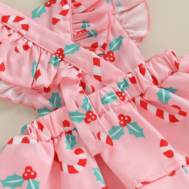 This delightful romper is the perfect ensemble for spreading holiday cheer. Adorned with adorable Christmas candies prints, it captures the joy and playfulness of the season. The ruffled detailing adds a touch of whimsy and charm to the outfit, while the soft and comfortable fabric ensures your baby's ease throughout the festivities.