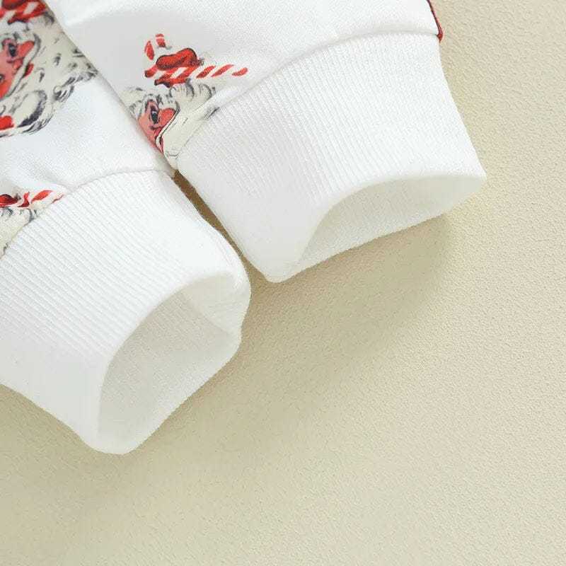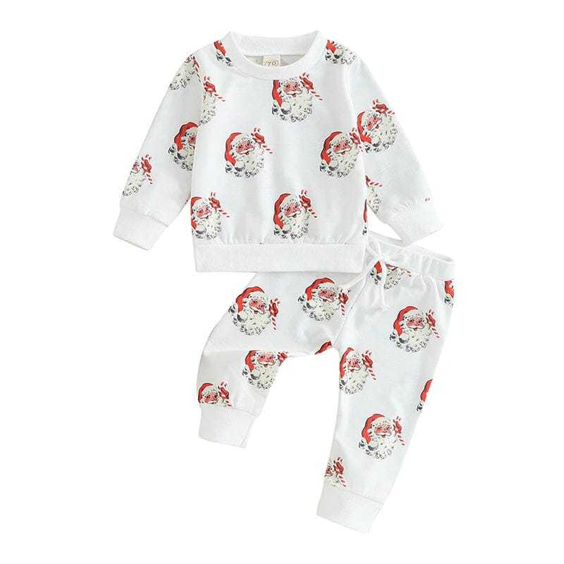Dive into the festive mood with this captivating ensemble designed to sprinkle holiday cheer. The crisp white sweatshirt, adorned with delightful Santa motifs, is a nod to the joyous spirit of the season. When paired with matching pants, it crafts a harmonious holiday look that's both playful and stylish. Crafted from soft, breathable materials, this outfit promises comfort while ensuring your little one shines bright in all those memorable Christmas moments, be it family gatherings or cozy evenings by the tree