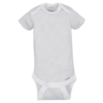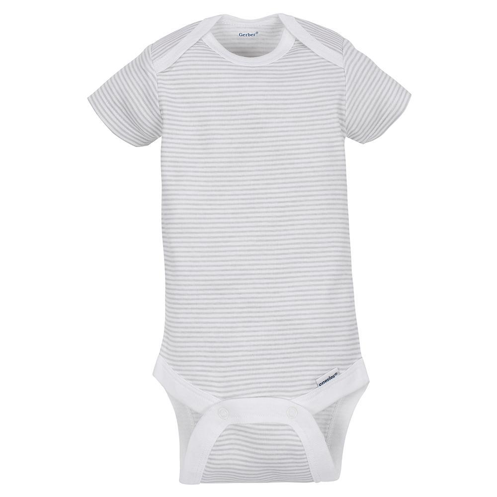Add some fun to your little one's look with this 5-pack of neutral variety Gerber Onesies庐 brand short sleeve bodysuits. There's an assortment of creative and interesting color combinations to choose from in this adorable set. Whimsical designs that feature screen-print and puff print make these pieces stand out. You'll enjoy pairing these items with other favorites from this collection or mixing and matching with your wardrobe favorites. Each bodysuit is made from 100% cotton for a soft and breathable feel. Whether the day calls for running errands around town with mom or heading out play the day away with pint-sized friends, these bodysuits will keep your little one feeling fantastic. The handy higher-in-the-front, bottom snap opening keeps diaper changes easier for busy moms. An expandable lap shoulder neckline allows the bodysuit to pass easily over baby's head. This set comes in sizes that range from newborn to 6-9 months to keep your little one covered. The easy care fabric keeps laundry day simple.