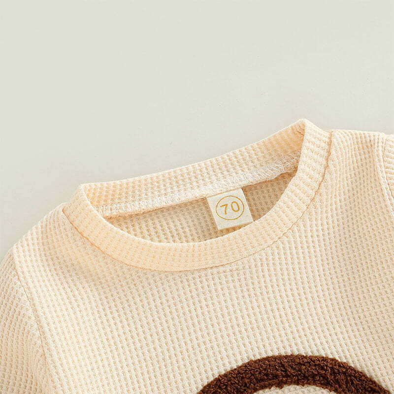 Your little one will be cozy and stylish in this adorable unisex baby outfit, featuring a beige waffle-textured sweatshirt with a colorful rainbow pattern and matching solid pants. The comfortable and breathable fabric is perfect for any season, and the sweet rainbow design is sure to bring a smile to everyone's face. Whether your little one is at play or lounging at home, they'll be cute and comfortable in this trendy and versatile outfit.
