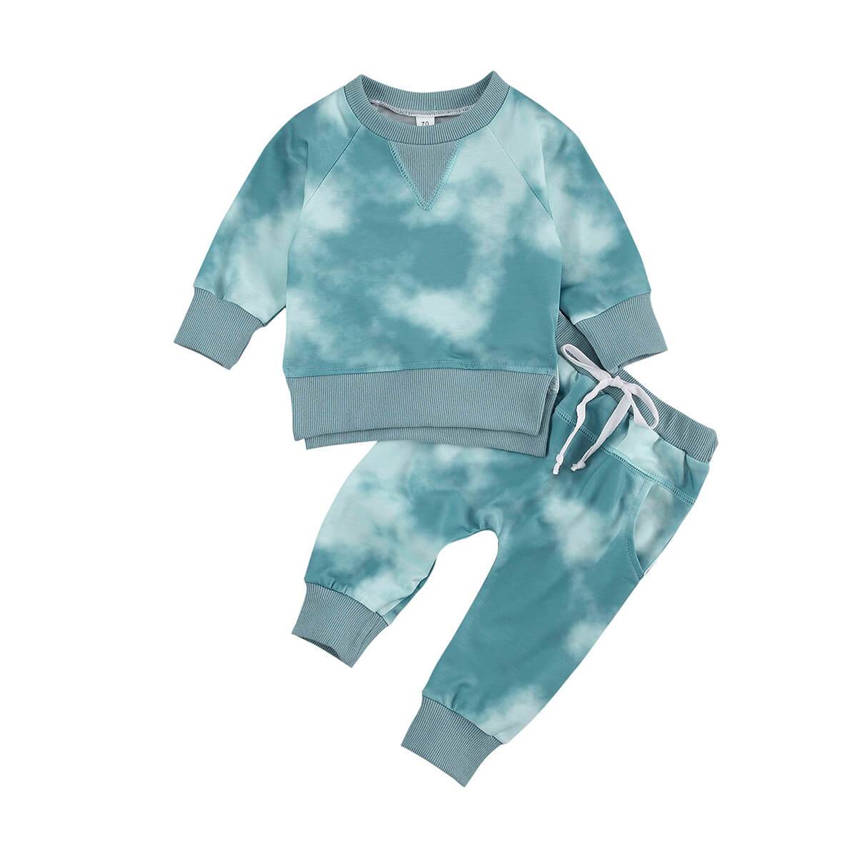 The set includes a cozy blue tie dye sweatshirt and matching pants that are both made from a soft and breathable material, ensuring your little one is comfortable all day long. The sweatshirt features long sleeves and a ribbed neckline and cuffs, while the pants come with an elastic waistband for a snug and comfortable fit. Whether you're lounging at home or out and about, your baby will look cute and stylish in this fun and trendy tie dye set.
