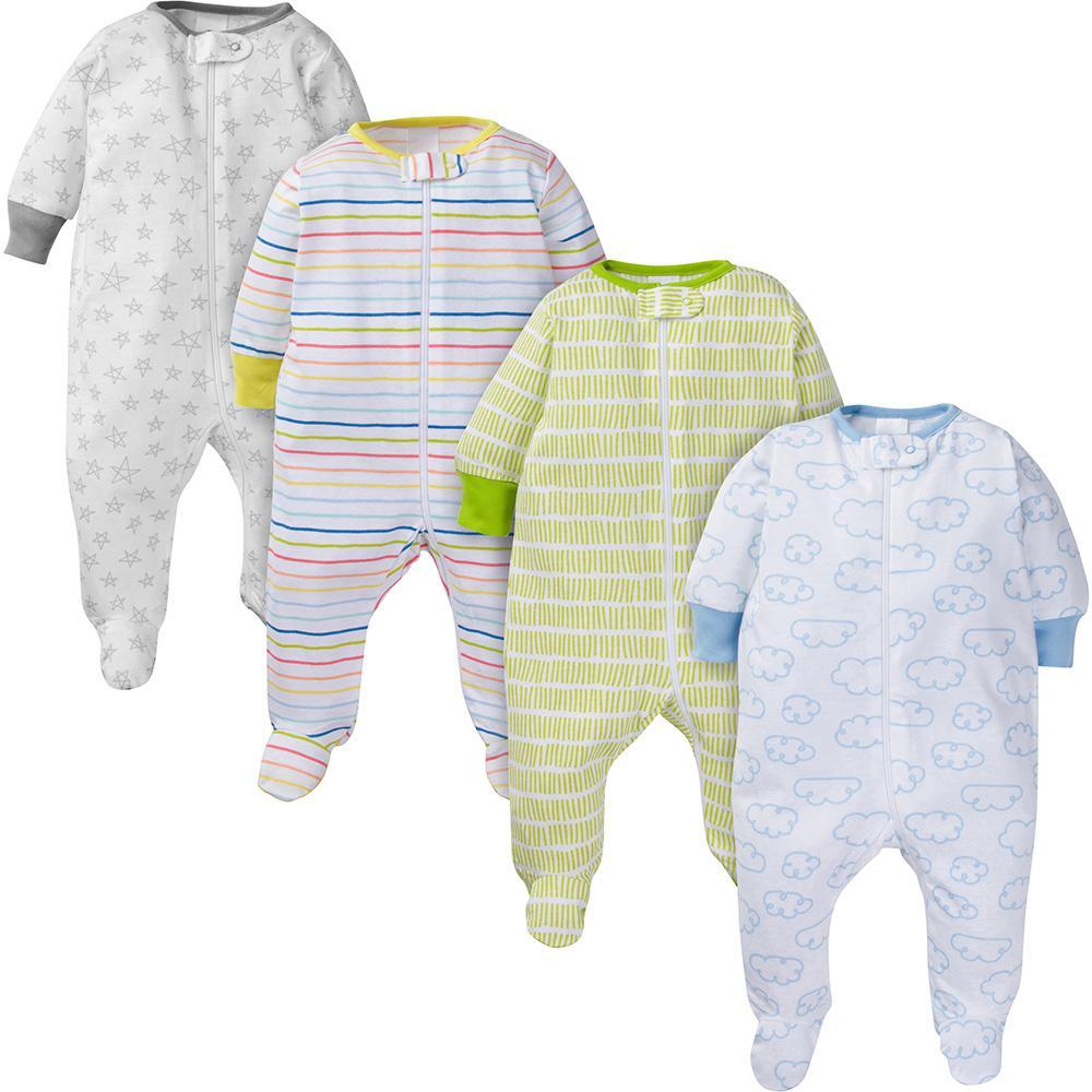 Bring out those adorable smiles at naptime or playtime with this 4-pack of baby unisex Sleep N' Plays. The precious designs and colors appeal to little ones and give mom plenty of choices for dressing baby for the day. 100% cotton jersey fabric provides warmth and comfort. The footed bottoms keep those little feet feeling toasty. A front zipper opening streamlines the dressing routine and makes diaper changes easier too! The soft fabric zipper neck tab protects the chin from scratches. These easy care items sail through the machine washer and dryer for a hassle-free cleaning!